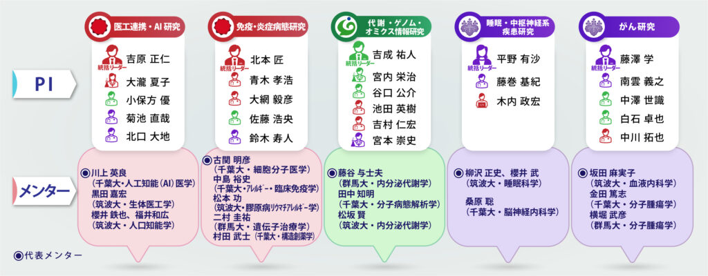 本事業では、次世代・若手医学系研究者の研究力強化と分野横断的研究の推進を目的として、3大学共通のメンター体制を構築している。各研究グループに経験豊富なシニア研究者をメンターとして配置し、研究計画の高度化、異分野連携の促進、国内外の研究ネットワーク形成およびキャリア形成を支援している。これにより、次世代PIの自立的な研究推進能力の向上を図るとともに、国際的に活躍できる医学系研究者の育成を推進している。
