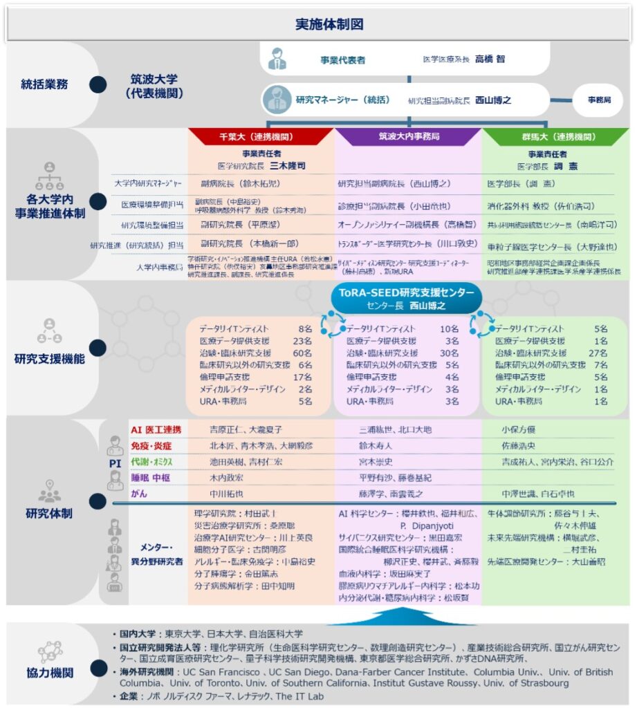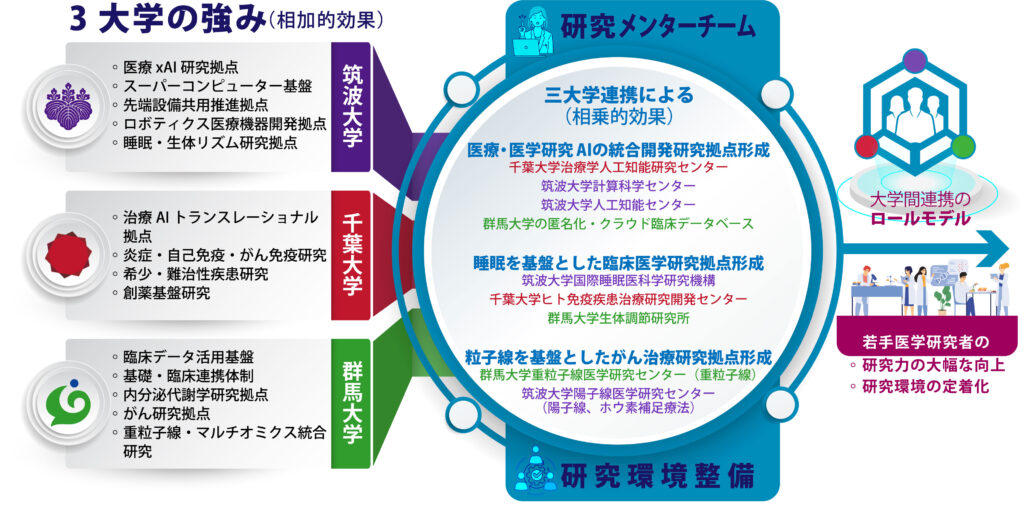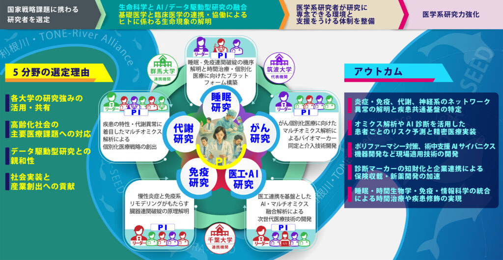 筑波大学・千葉大学・群馬大学の関東 3 大学がアライアンス(ToRA-SEED (Tone River(利根川) Alliance for Scientific Excellence and Educational Development)を結成し、国家戦略課題である「生命科学と AI/データ駆動型研究の融合」および「基礎医学と臨床医学の連携・協働によるヒトに関わる生命現象の解 明」に取り組む。3 大学の研究力の強みを生かした 5 つの重点研究領域(AI・医工連携、炎症・免疫、代謝・ オミクス、睡眠・神経、がん)を軸に、マルチオミクス解析と数理・AI 解析を融合したデータ駆動型医学 研究を推進する。臨床業務軽減制度、研究支援センターの設置、研究機器・材料の共用化、研究メンターチ ームの編成、研究支援人材の配置、異分野連携を促進するシステム、チャレンジファンドの整備を通じて、 医学系研究者が研究に専念できる環境を整備するとともに、挑戦的・萌芽的研究への支援を行う。これに より、医学系研究力の向上と次世代・次々世代 PI の育成体制を定着させ、全国の大学への展開が可能な大 学間協働のモデルケースの構築を目指す。