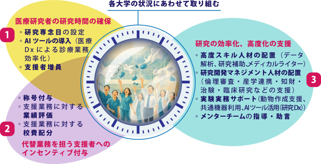 研究者支援制度 HOME > 研究環境整備 > 研究者支援制度 本事業では、研究時間確保のための業務負担軽減や代替業務支援体制の整備を進めるとともに、三大学連携による研究支援とメンタリングを通じて研究者の研究推進を支援し、次世代・次々世代PIの育成を推進している。 医学系研究者の研究に専念するための環境整備